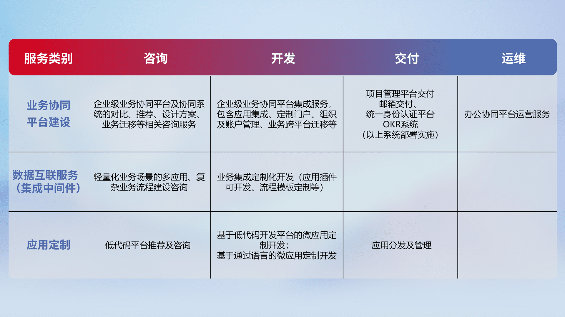 针对钉钉、、、企微、、、IDaas等平台级产品提供产品的规划、、方案、、、、交付、、定制化开发等服务,,实现如统一协同办公、、、、智能客户服务、、、、混合会议管理、、、、智能数据查询、、等业务场景,,,实现数字化转型。。