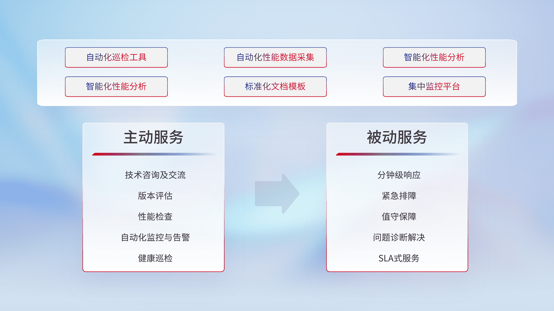 智能化工具和标准化文档,,保障服务质量,,,,提供主动服务(包含技术咨询、、、、版本评估、、性能检查、、、自动化监控与告警、、、、健康巡检)和被动服务包含(分钟级响应、、紧急排障、、、、值守保障、、、问题诊断解决、、、SLA服务)。。。